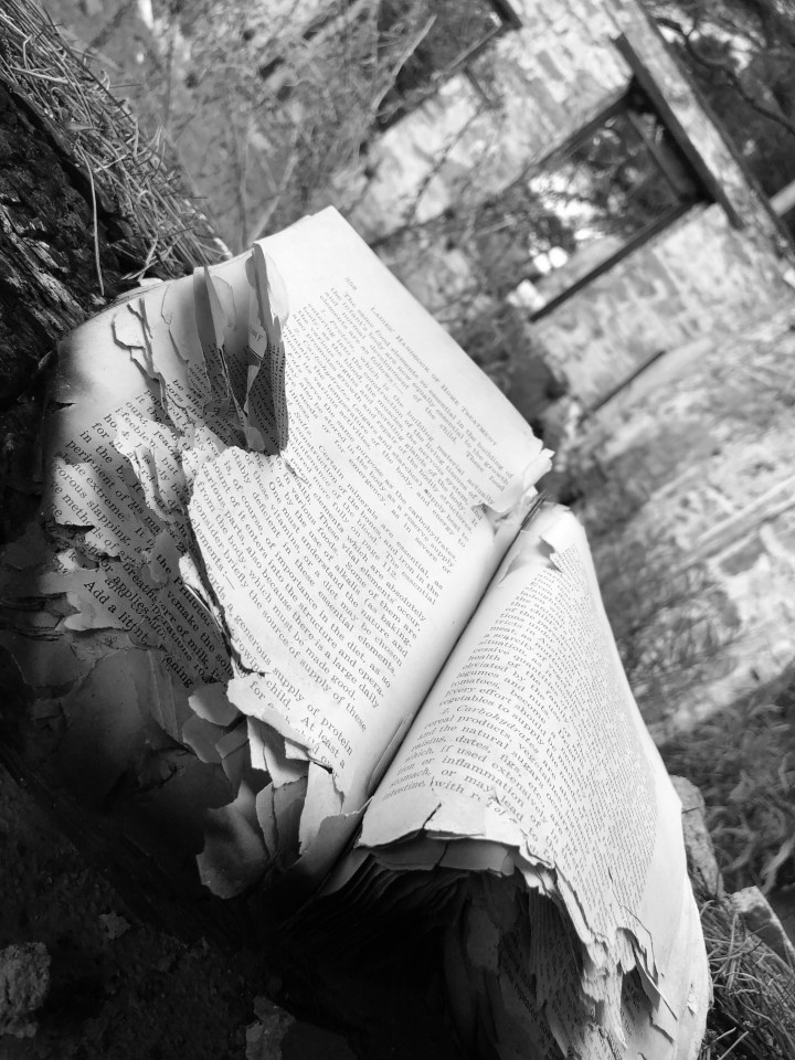 I recently found a house in the mountains, burnt out and abandoned. Resting on a window pane, its tenuous pages teased by the wind, was a partially charred book. The page settled in the breeze. As I took a photo I noticed how tragically ironic the words were.