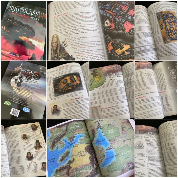 SHOTGLASS ADVENTURES 3: BLACK MERIDIAN HEART is now available in digital PDF and print from DrivethruRPG! 136 pages of awesome, mind bending adventures and campaign materials for 5e and OSR role playing games!