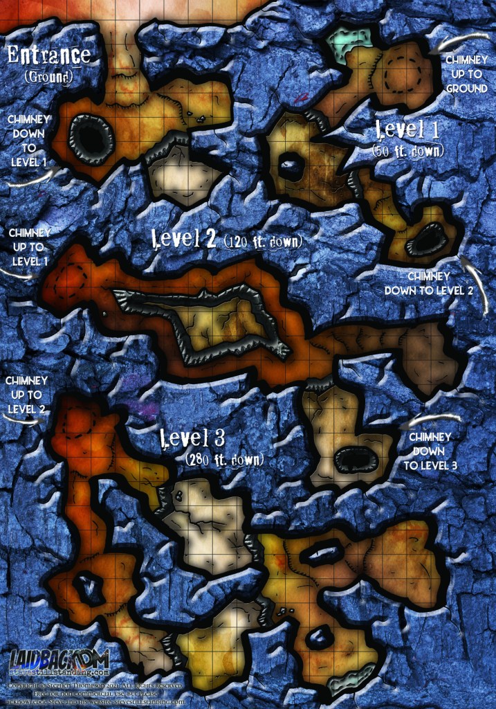 And the reason why the PCs need to get to the bottom-most cave? Maybe the lowest level was used by a wizard to store a powerful magic item, or perhaps the queen of the swarm has all the treasure her critters collected along the way? Maybe the party tracked the swarm here because they attacked a nearby village and took a bunch of people to eat… Go wild, my friends.