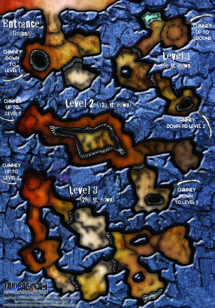 This cave has four levels, with connecting chimneys accessing each level (I’ve included labels as it might get a bit confusing as to what connects to where). It’s designed to be narrow and cramped. I love PCs getting jammed up in small spaces – claustrophobia anyone? And take that, AOE spells! The monsters will have to be small to take advantage of the small tunnels – perhaps a huge swarm of critters!