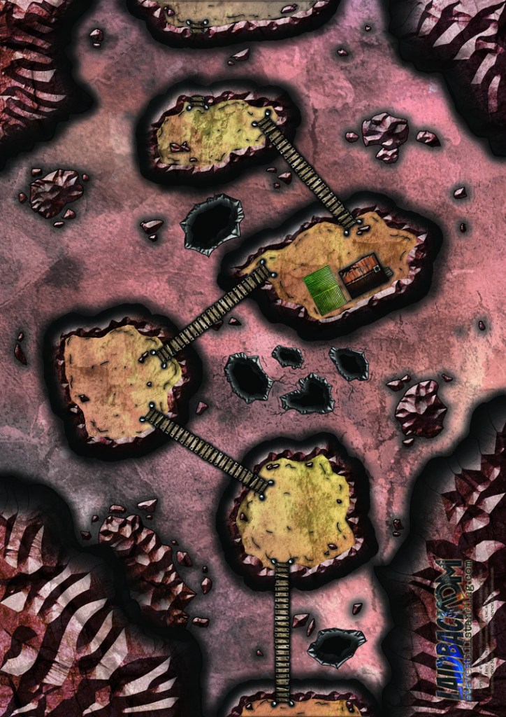 A valley between mountains and within: a number of high mesas connected by rope bridges. Someone lives on one of the mesas at the center, high above a number of deep, chasm-like tunnels below. What lurks on the valley floor and below it? And what does the lone hermit have to do it? Are they mind-controlling purple worms? Or protecting the world from the threat that lies beneath them? That’s up to you…
