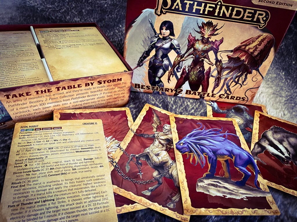 I like Battle Cards, and these ones are very nice. I know Paizo probably won’t fix the issue of making sure all the info is on the cards for bigger monsters, but since I’ve bought them I guess I’ll put up with it. Time for me to buy some more P2e stuff to feed my ongoing addiction. Big sigh…