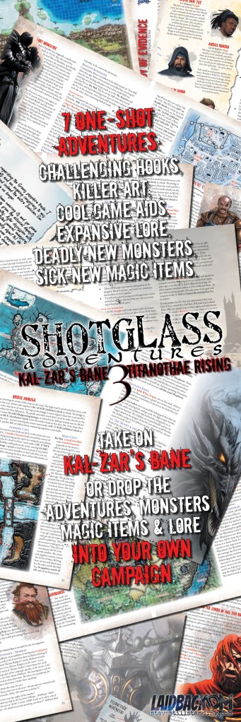 SHOTGLASS ADVENTURES – Kal-Zar’s Bane 3: TITANOTHAE RISING contains loads of hand-drawn, full-color maps, 28 new monsters & NPCs, 17 new magic items, new towns, villages and region settings, expanded lore + map of Verona Province (the frontier setting for Shotglass Adventures)!