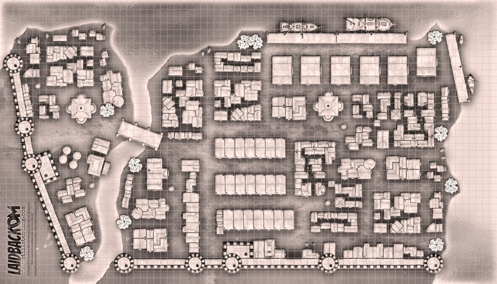 This old school sepia-tone port town has 10 ft. squares (but you can change that depending on how big you want the town to be). Ideal for small port-side baronies, smuggling ops, town heists, invasion stories, etc. Go for it!