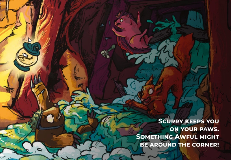 There is much to love about Scurry, especially if you enjoy narrative-driven games that emphasize role playing. It has wonderful layouts and evocative, cartoon-influenced art, uses simple rules that are easy to learn, is fast paced and supports positive environmental themes. It’s ideal for players young and old, whether they are experienced with TTRPGs or not.