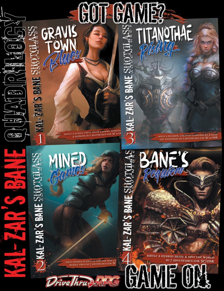 Published under the OGL, compatible with 5e and easily-convertible to many OSR fantasy role playing games, SHOTGLASS ADVENTURES – Kal-Zar’s Bane 4: BANE’S REQUIEM is 154 pages of adventures that can be played as One-Shots or as the last module in a four-part campaign.