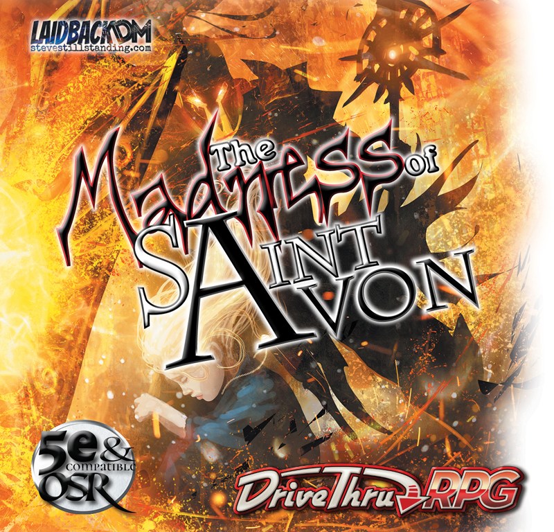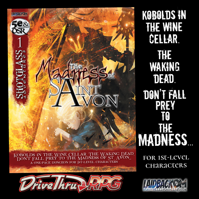 And that’s what this is. The Madness of St. Avon is a simple, One-Page One-Shot for 5e and OSR systems, including full stat blocks for both 5e and OSR/1e monsters and grid and grid-less maps. And all for $2 US.