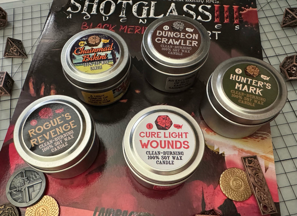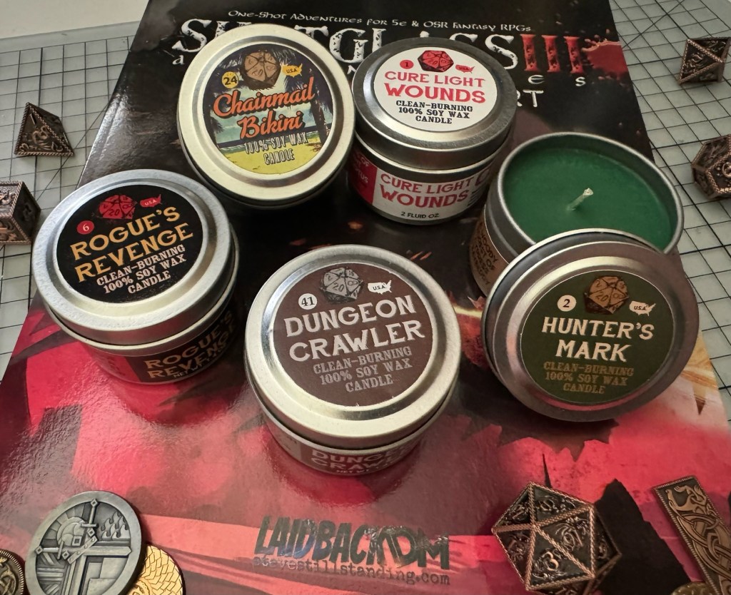I just received some fantasy TTRPG-themed, scented candles in the mail (the chain mail lol. Okay, that was a bad Dad joke). I know what you’re thinking, because it’s exactly what I was thinking: “What the f*&% am I gonna do with candles?” I’m not a candle or incense kinda guy. Nothing against those who like that stuff, but I’ve never seen the need for them, despite long-term incense/scented candle indoctrination/nasal assaults by various girlfriends. I’d rather break out the weights or dance on the inside/headbang to metal.