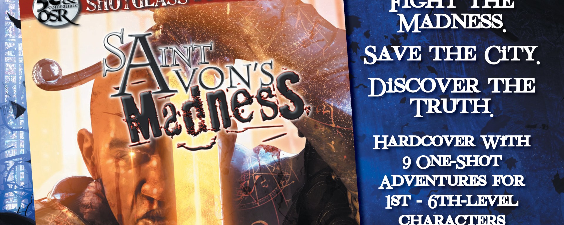 Saint Avon’s Madness is a Hardcover Print Collection of the 9 adventures + City Setting from the Shotglass Adventures PDF One-Shot series! All are fully play-tested One-Page One-Shots for 5e and OSR systems for 1st-6th level characters, including full stat blocks for both old and new 5e and OSR/1e monsters, new magic items and grid and grid-less maps.