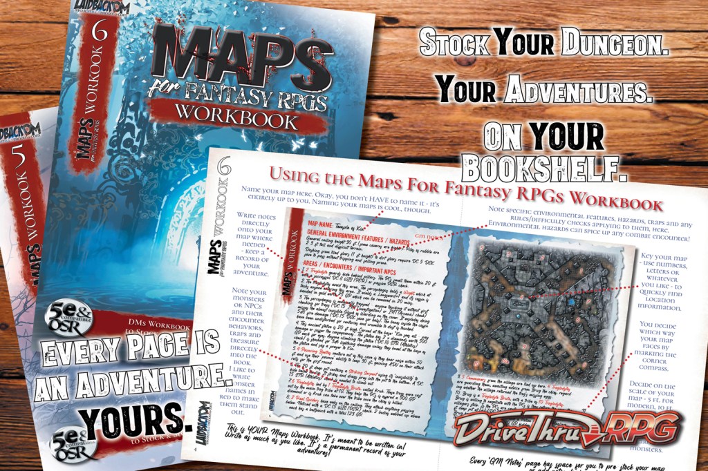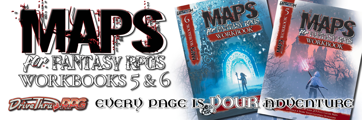 MAPS For FANTASY RPGs Workbook 5 & 6 are 128-page softcover books/PDFs with 20 full color, hand drawn, grid and grid-less maps from the MAPS FOR FANTASY RPGs 5 & 6 Digital Maps Packages and include spaces to name maps, stock dungeons and/or add notes as you run players through your adventures!
