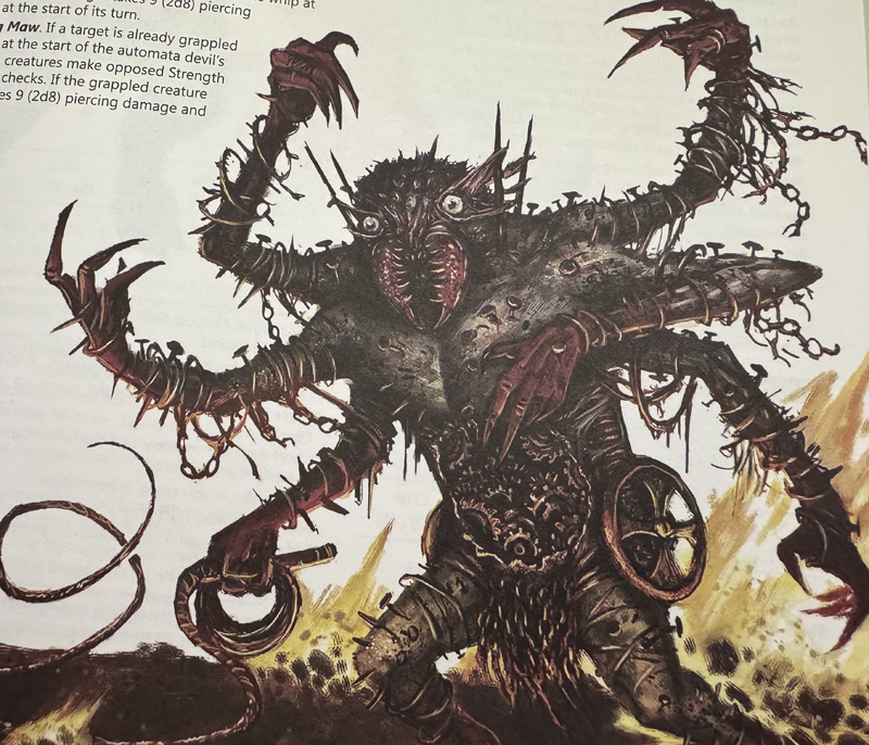 Off to Crabber’s Cove, and Thessalia experienced another vision of hell, this time with Alyona in the distance. As Thessalia reached her, Alyona turned, revealing herself as a monstrous fiend. Thessalia explained this to the party. Somewhat conveniently, Granak had done much research into the Nine Hells, and identified the hellscape in Thessalia’s visions as Avernus, first layer of Hell and entryway to the Nine Hells. Additional facts came to light: only specialized portals, usually formed via powerful magic items, allowed passage to Avernus and back; time flowed differently in Hell from the prime material plane. Thessalia realized that the special pearls her clan used in their coming-of-age ceremonies were actually items from Hell. Perhaps this was why she was having visions?