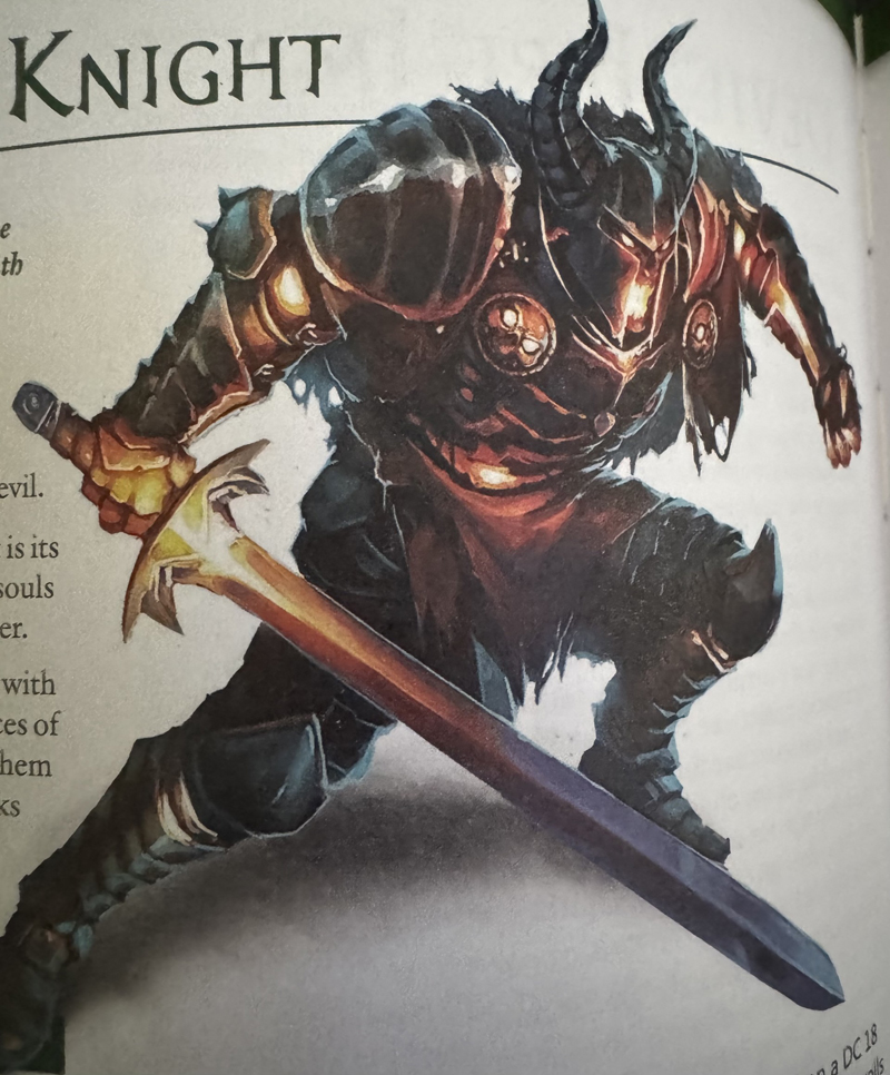 Not long after, a column of barbed devils assembled outside the building, calling on the party to exit. One hasty plan later, Fr’an’kk, Keraston and Granak led the devils away, while Fa’aoa (wreathed in invisibility cast by Felix) and Felix (with the aid of enhanced ability cast by Granak) furtively made their way through Elturel’s streets to a rendezvous near the cemetery. After a quick reconnoitre, the party entered the cemetery and headed to a chapel at its center. The paths were strangely quiet. As they arrived, a new Infernal Knight flew down from above: “The bounty is mine.”