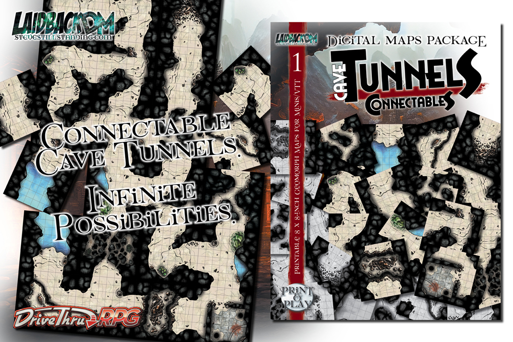Laidback DM’s Print-&-Play Connectables – Cave TUNNELS 1 Digital Maps Package is a collection of 15 full color, hand drawn, 8×8-inch, gridded, inter-connectable cave tunnel maps for 2-3 inch miniatures, plus 15 full color, grid-less versions for VTT, plus 30 JPEGs in grayscale (a total of 60 JPEGs)!
