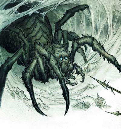 As this happened, a giant spider lowered itself from the ceiling. Bastonn was hit by its poison stinger and temporarily paralyzed. Volcarian blasted the spider to fiery smithereens with a powerful fireball. To the north was another short tunnel with another portcullis. This one was locked; a broken key prevented it from being opened. The sound of echoing footsteps again, coming closer. The party hid in the rubble, spying a mighty humanoid creature in black metal armor, with a skeletal face and glowing eyes. It stopped when it saw the dead spider, seemed faintly curious, then turned and walked away.