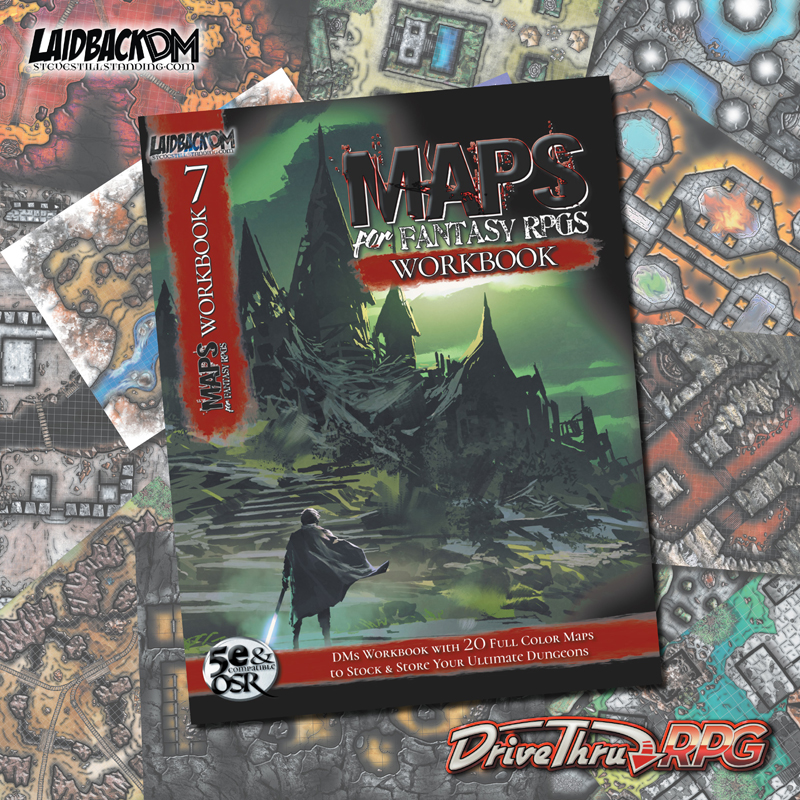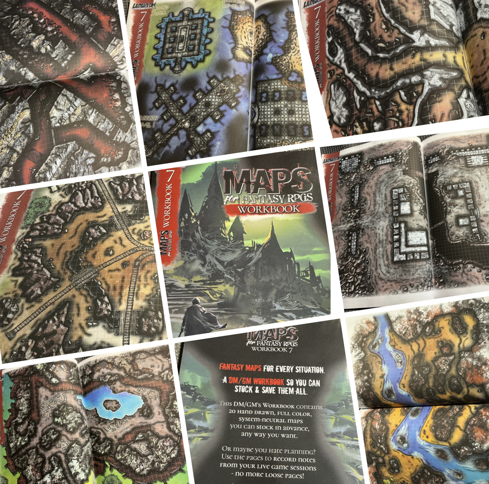 MAPS For FANTASY RPGs Workbook 7 is a 128-page softcover book/PDF with 20 hand drawn, full color, grid and grid-less maps includes spaces provided to name maps, stock dungeons and/or add notes as you run players through your adventures!