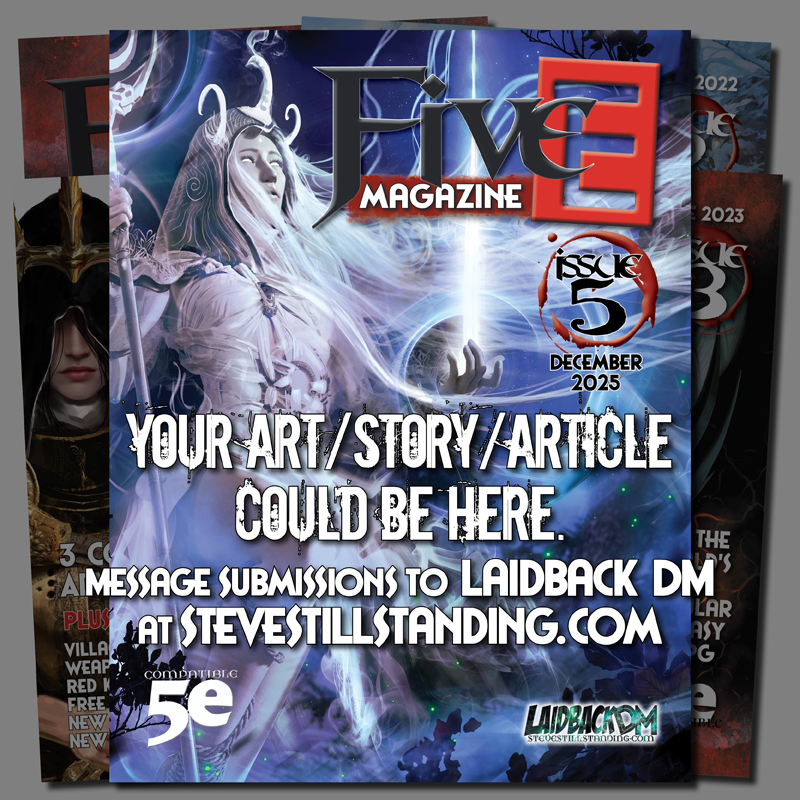 We’re now taking submissions for FiveE Magazine Issue 5. If you would like to see your DnD 5e article, art or adventure in print, check out the submission guidelines below and message us at https://stevestillstanding.com/message-me/