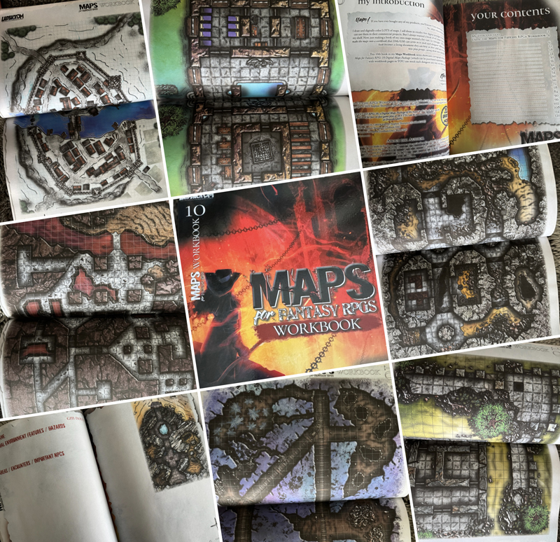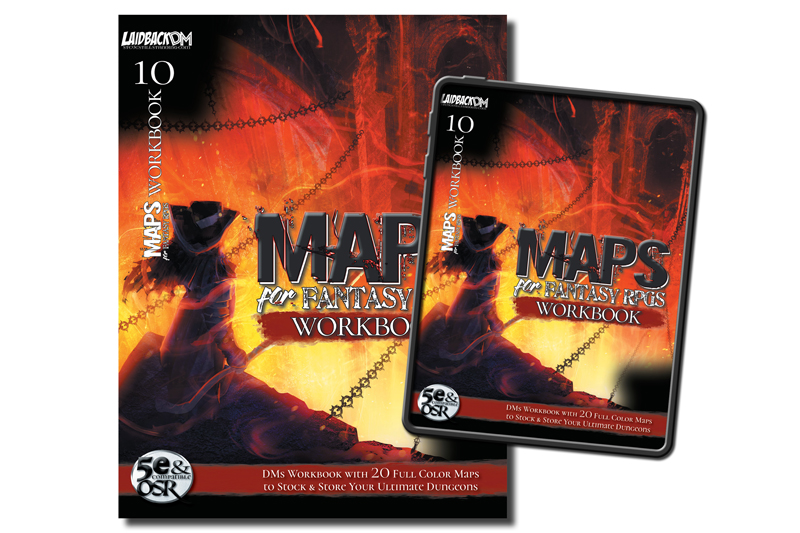 ‘MAPS For FANTASY RPGs Workbook 10’ is a 128-page softcover book/PDF with 20 hand drawn, full color maps which includes spaces provided to name your maps, stock your dungeons and/or add notes as you run players through your adventures!