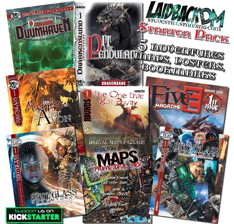 What better way to start than with the Laidback DM Starter Pack – 4 Adventures, FiveE Magazine #1 (with a free adventure included), a maps pack, a poster book and a book of fantasy bookmarks – all in PDF/digital format so they get sent to you 2 weeks after the Kickstarter ends.