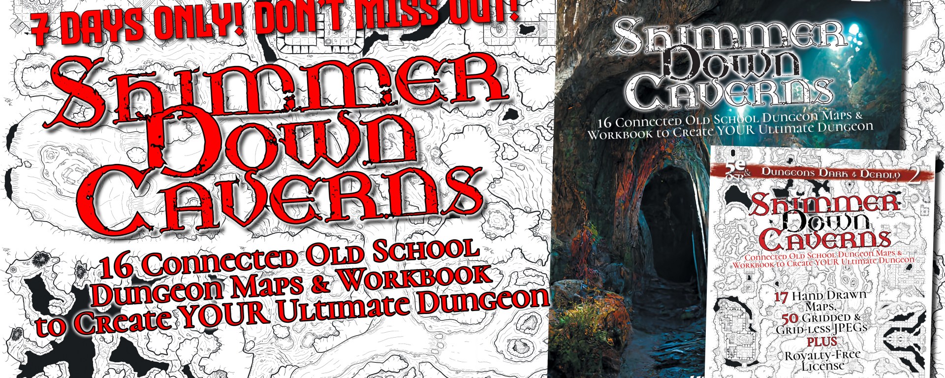 Shimmerdown Caverns, so-called because of its many embedded glowing crystals, have been used as mines and lairs for humanoids and monsters since time immemorial. Over the centuries mighty creatures have built their nests, temples and strongholds throughout the caves. What challenges and dangers lie within the tunnels, caverns and underground rivers of Shimmerdown? Only YOU know, because they’re YOURS to stock and adventure in!