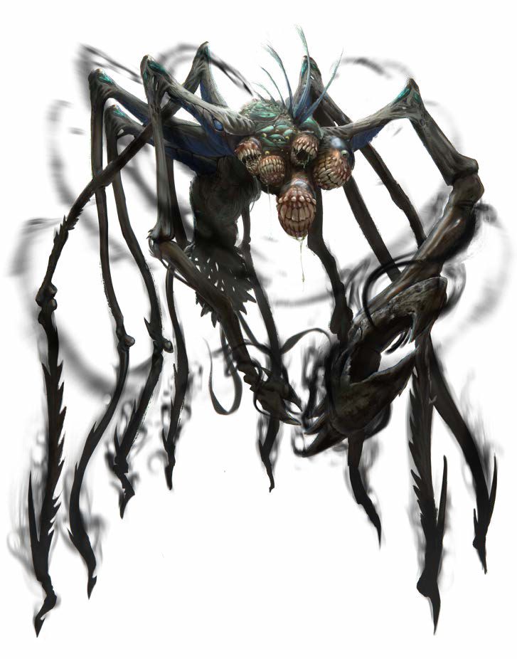 Eventually, the party reached the far north end of the cavern. They descended via their rope of climbing and left the edge of the fungi forest, entering a long natural tunnel that curved to the northwest. Making their way along, Gunnar spotted an eastern side tunnel. Unfortunately, he tripped and the sound of his all-metal armor, shield and scimitar scraping the rock floor brought a monstrous beast skittering from the east, its nightmarish body covered with thousands of eyes and tens of long, spidery legs.