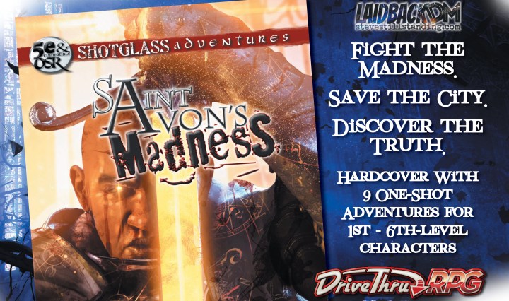 SHOTGLASS ADVENTURES  rides again!    Lurkers  and The St. Avon’s Day Massacre  are the newest adventures in the popular Shotglass Adventures PDF One-Shot series!  Both are fully play-tested One-Page One-Shots for 5e and OSR systems for 3rd-4th level characters, including full stat blocks with both old and new 5e and OSR/1e monsters, plus grid and … Continue reading SHOTGLASS ADVENTURES: ‘Lurkers’ & ‘The St. Avon’s Day Massacre’ are Available on DrivethruRPG!